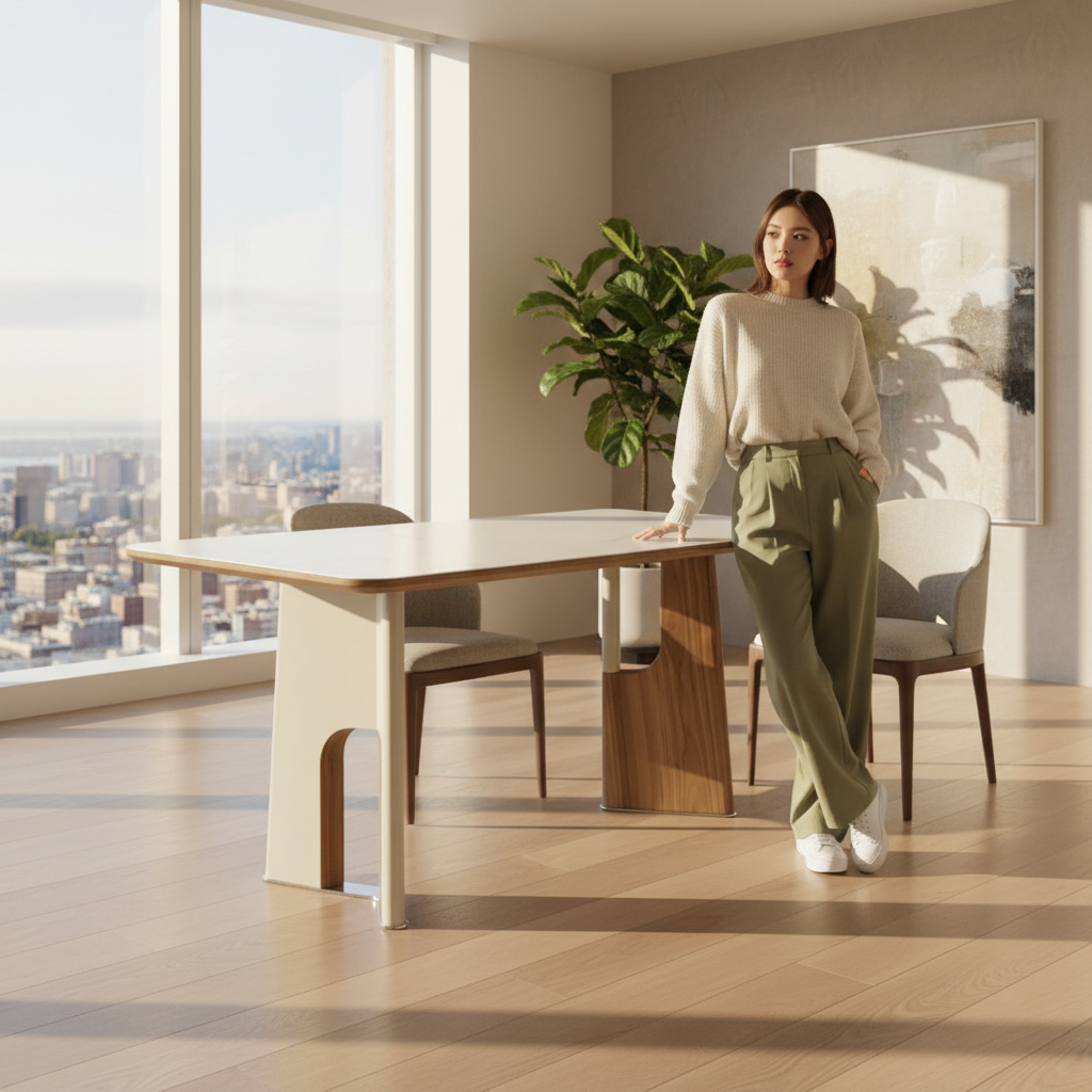 ● 百搭暖木色系 —— 木皮色澤自然溫潤,無論搭配灰白、奶茶或木色椅款皆相得益彰