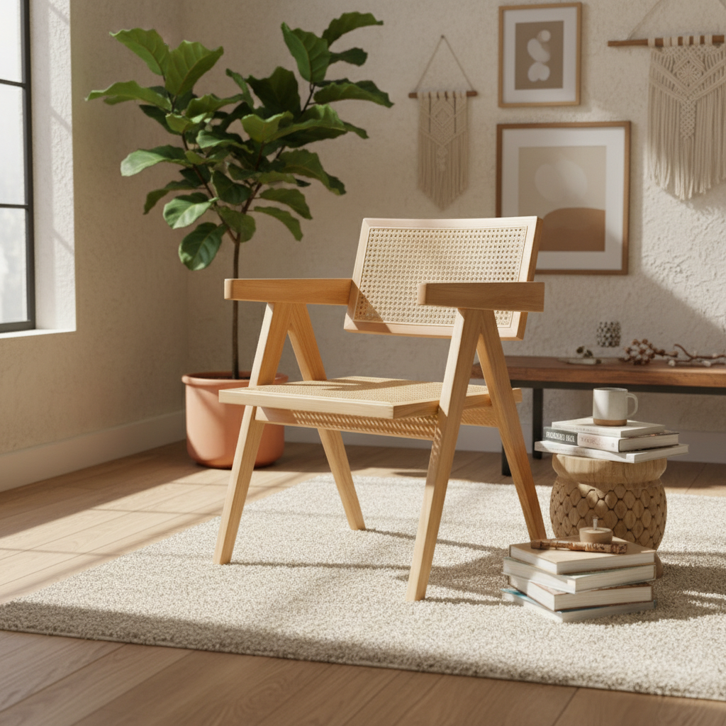 編織藤網的結合設計,更符合餐桌椅不同年齡層的需求,扶手款設計也能增進單椅的包覆性,增加乘坐的時間,是談話椅的理想之選。