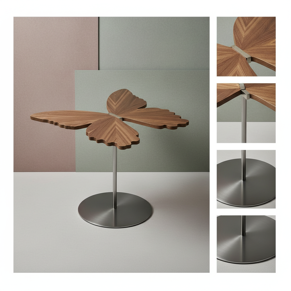 運用頂級胡桃木貼皮,以人字紋理勾勒出優雅的蝴蝶造型。單柱式底座設計極簡且穩固。此款邊几是高端室內設計中,不可或缺的視覺焦點。
